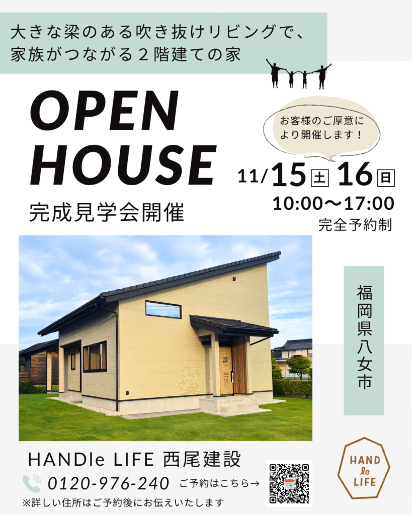 福岡県八女市で「大きな梁のある吹き抜けリビングの家」が完成しました!