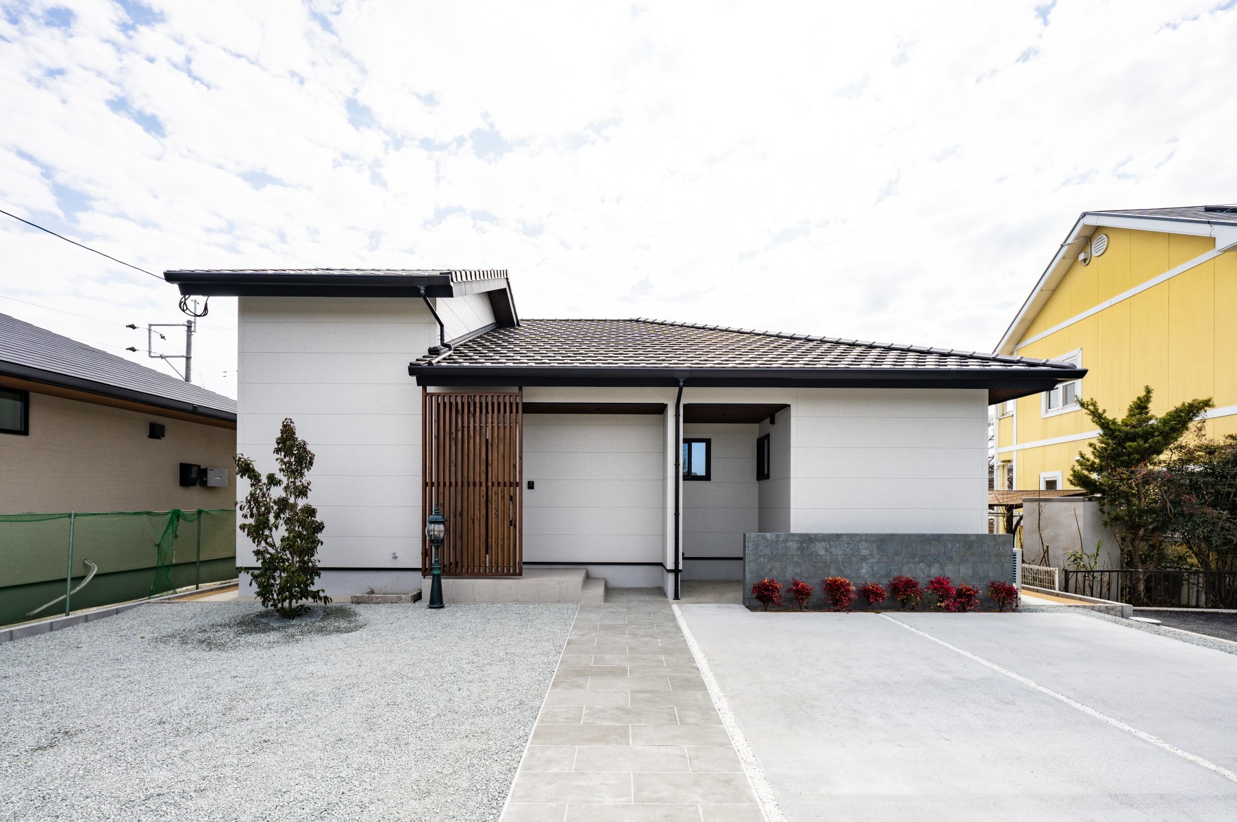 玄関ポーチへと続くアプローチが印象的な外観。玄関前に設けた木の格子が、外観のアクセントになっています。