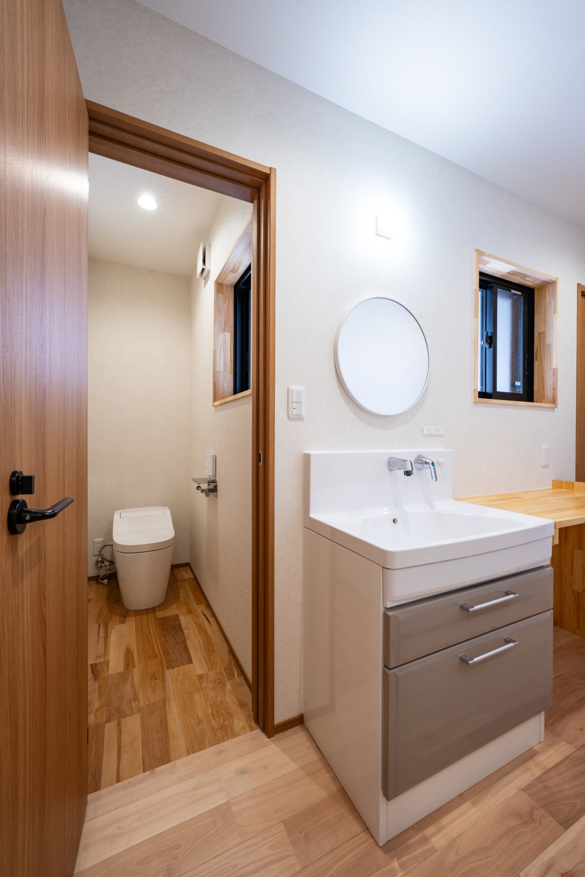 造作カウンター付きの独立洗面台を採用。 家族が並んで使えるゆとりある設計で、忙しい朝もスムーズに身支度が整います。