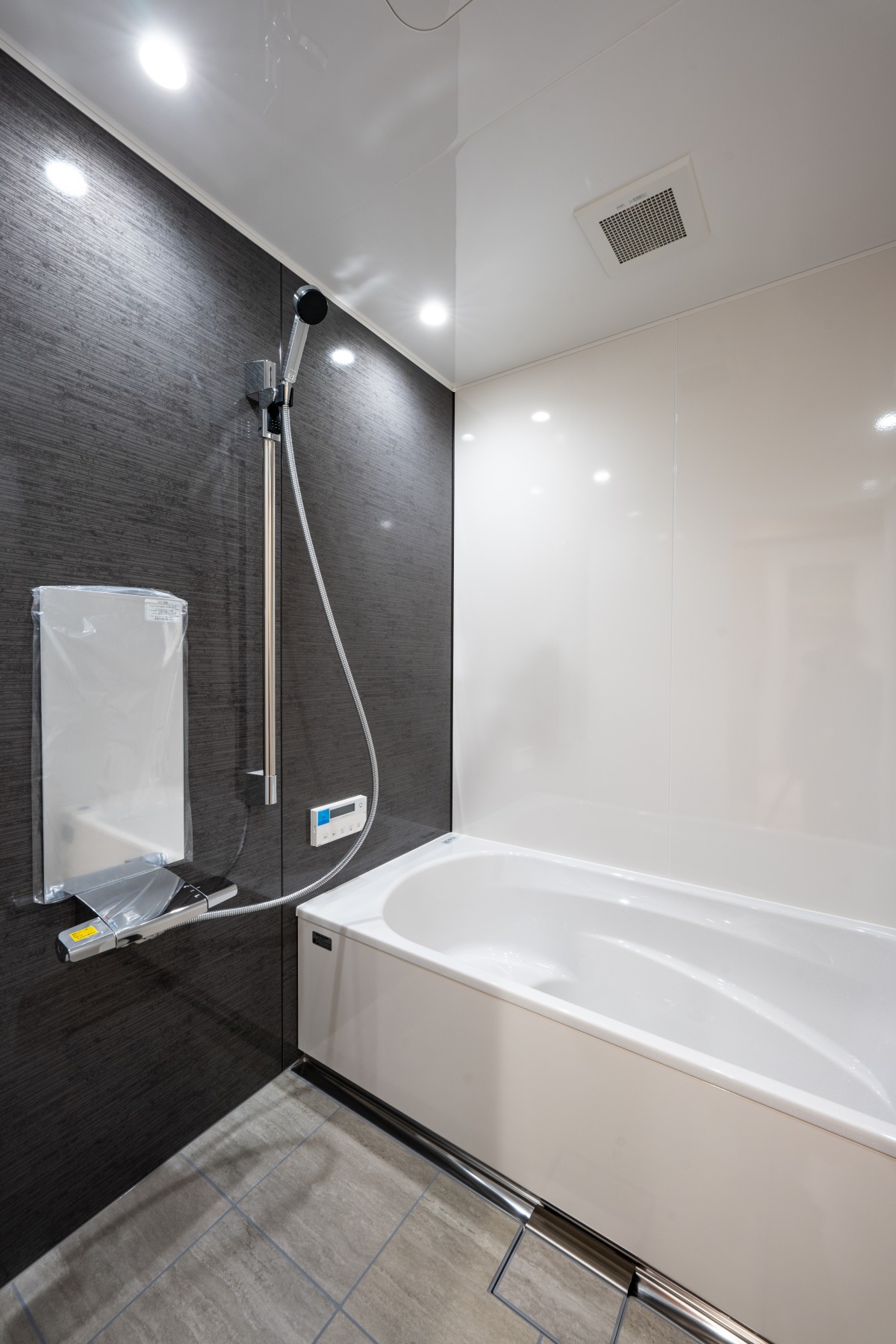 シンプルで落ち着いた色合いの浴室。 毎日の疲れをやさしく癒す、清潔感のある空間に仕上げました。