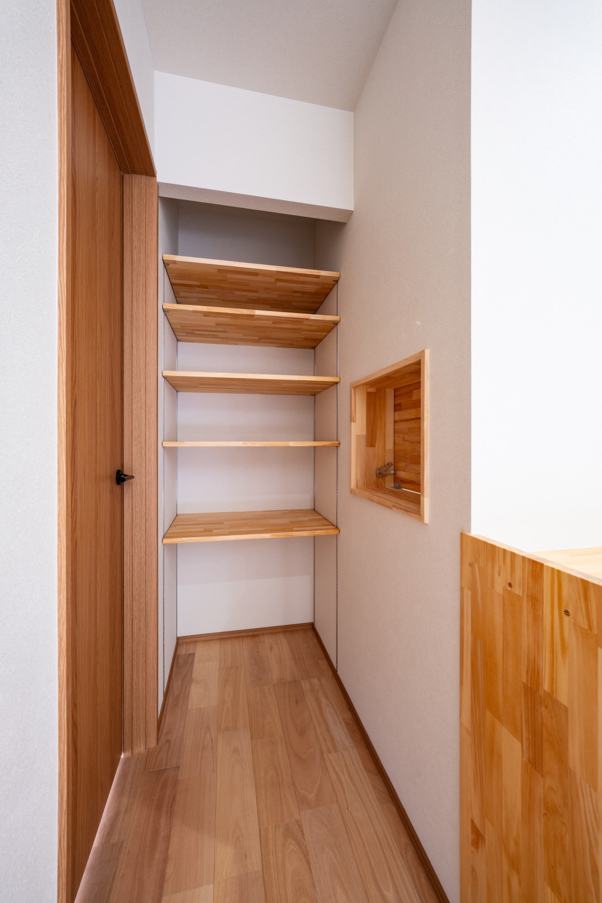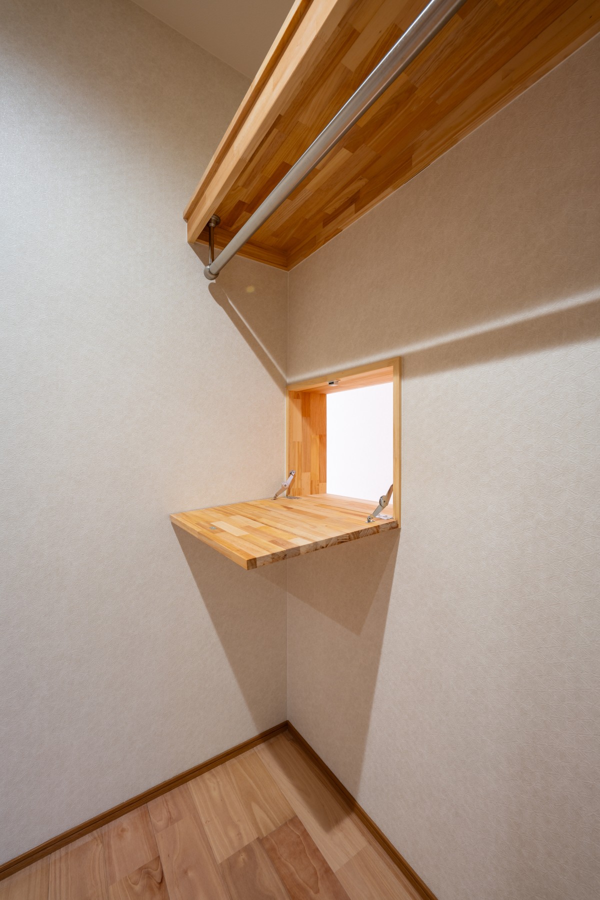 ファミクロに設けた開口窓。反対側は子ども部屋の前と繋がっており、衣類やバッグなど必要なものを受け渡しできる設計に。