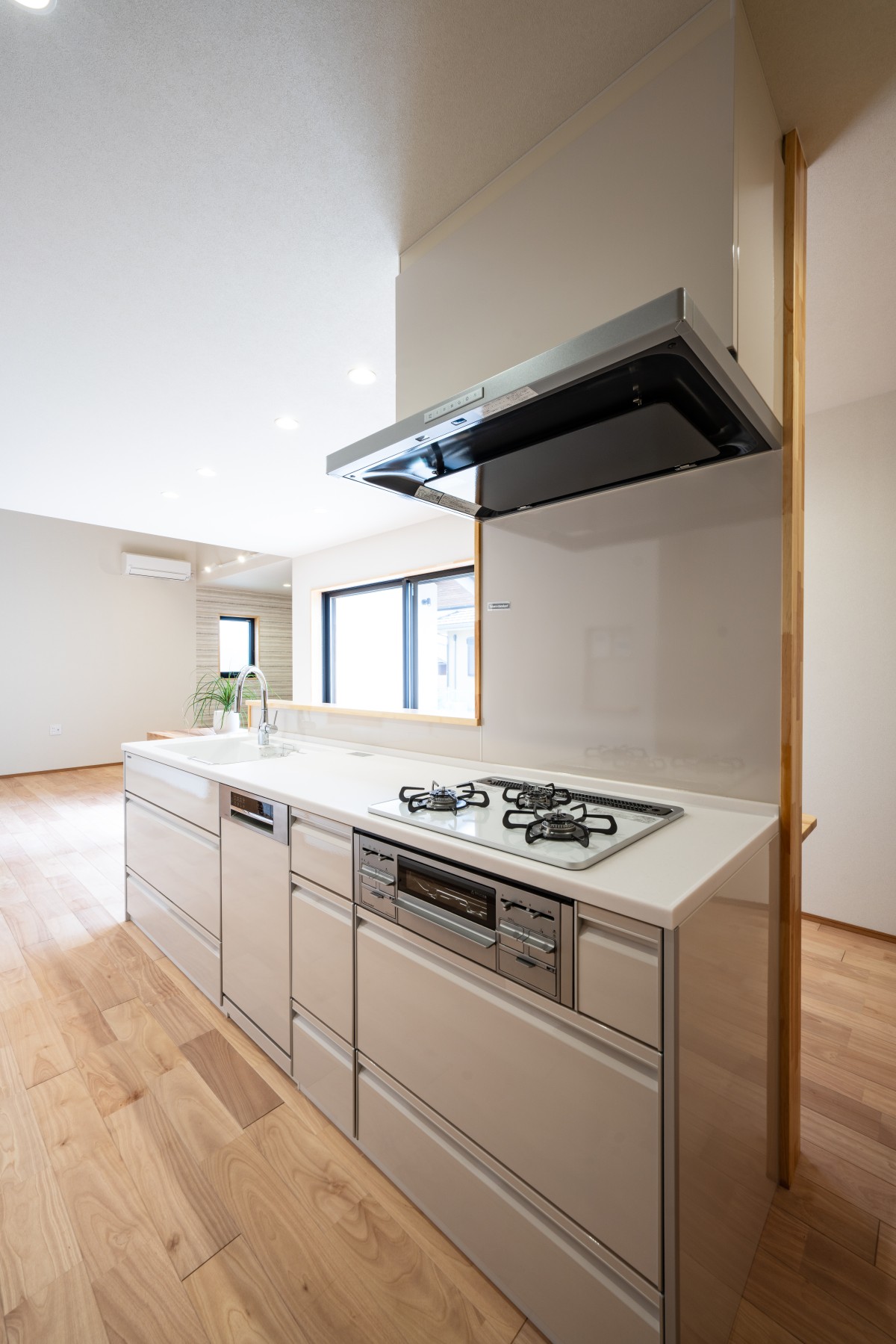 開放感のあるアイランドキッチンながら、コンロ前には壁を設けることで油はね対策にも配慮。デザイン性と実用性を両立しています。食洗器は幅60Lのフロントオープンタイプです。