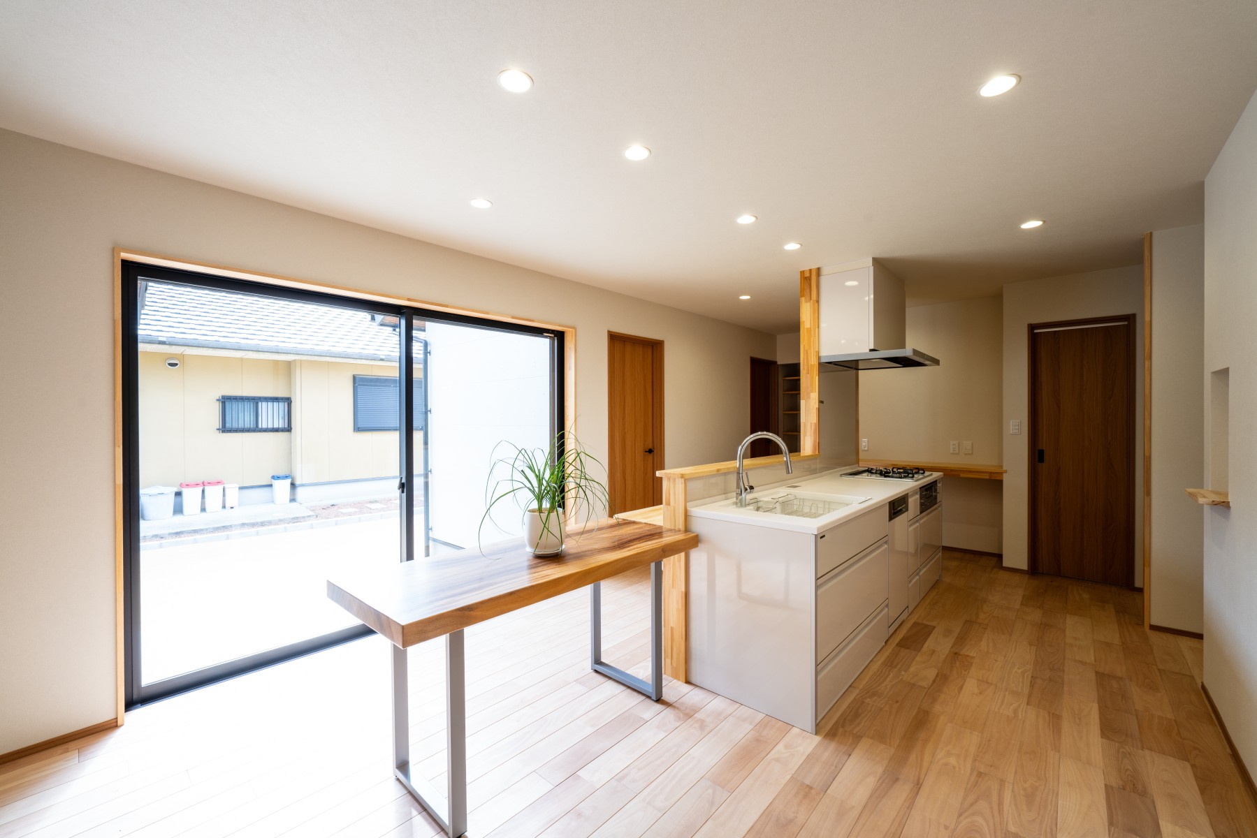 リビングとキッチンに面した大きな掃き出し窓から、そのまま庭へ出られる動線設計。 家事の合間の外干しやお子さまの見守りにも便利で、家族の時間をより豊かにしてくれます。