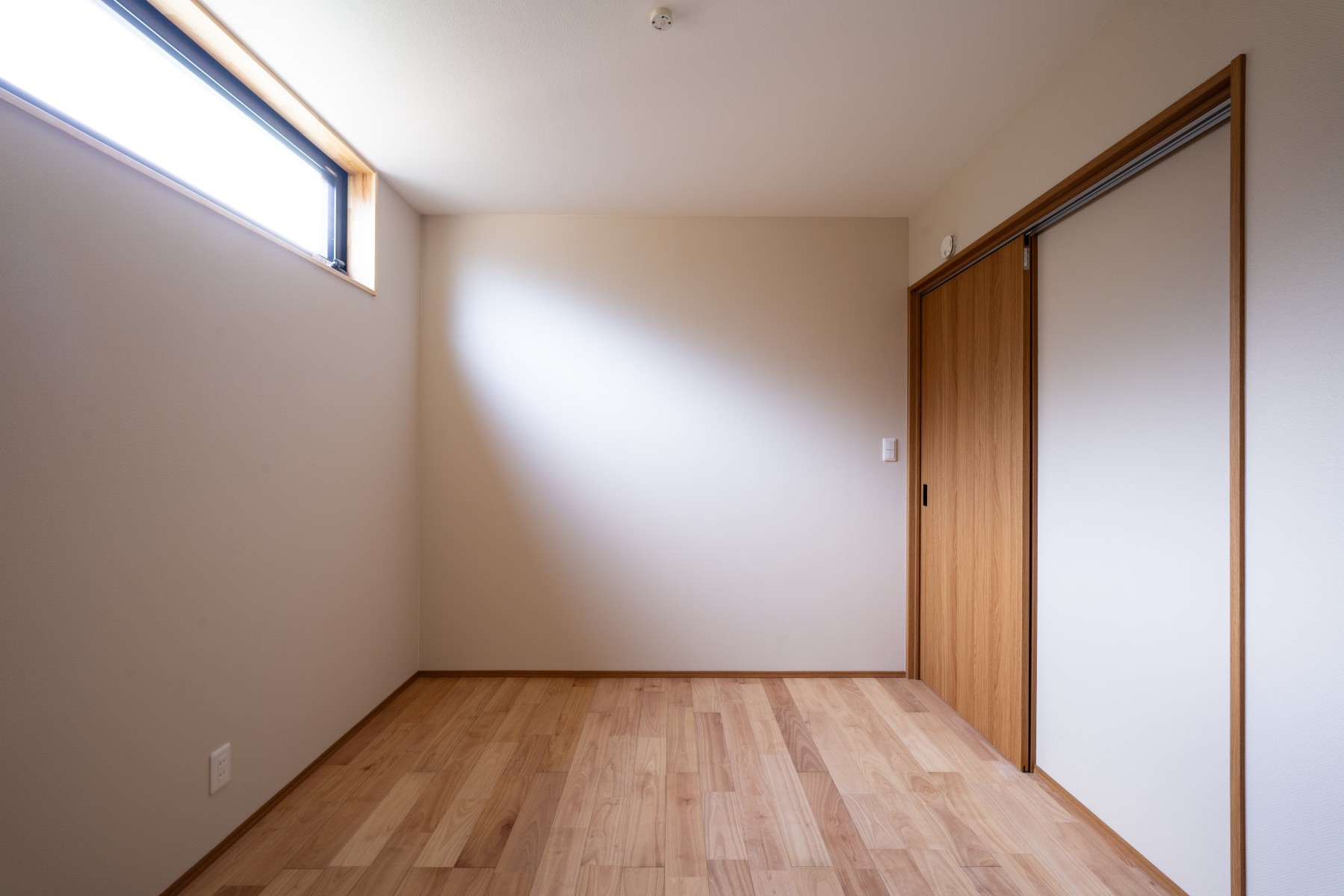 横長の窓から自然光がやさしく入る主寝室。 静かで穏やかな時間を過ごせる、くつろぎの空間に仕上げました。