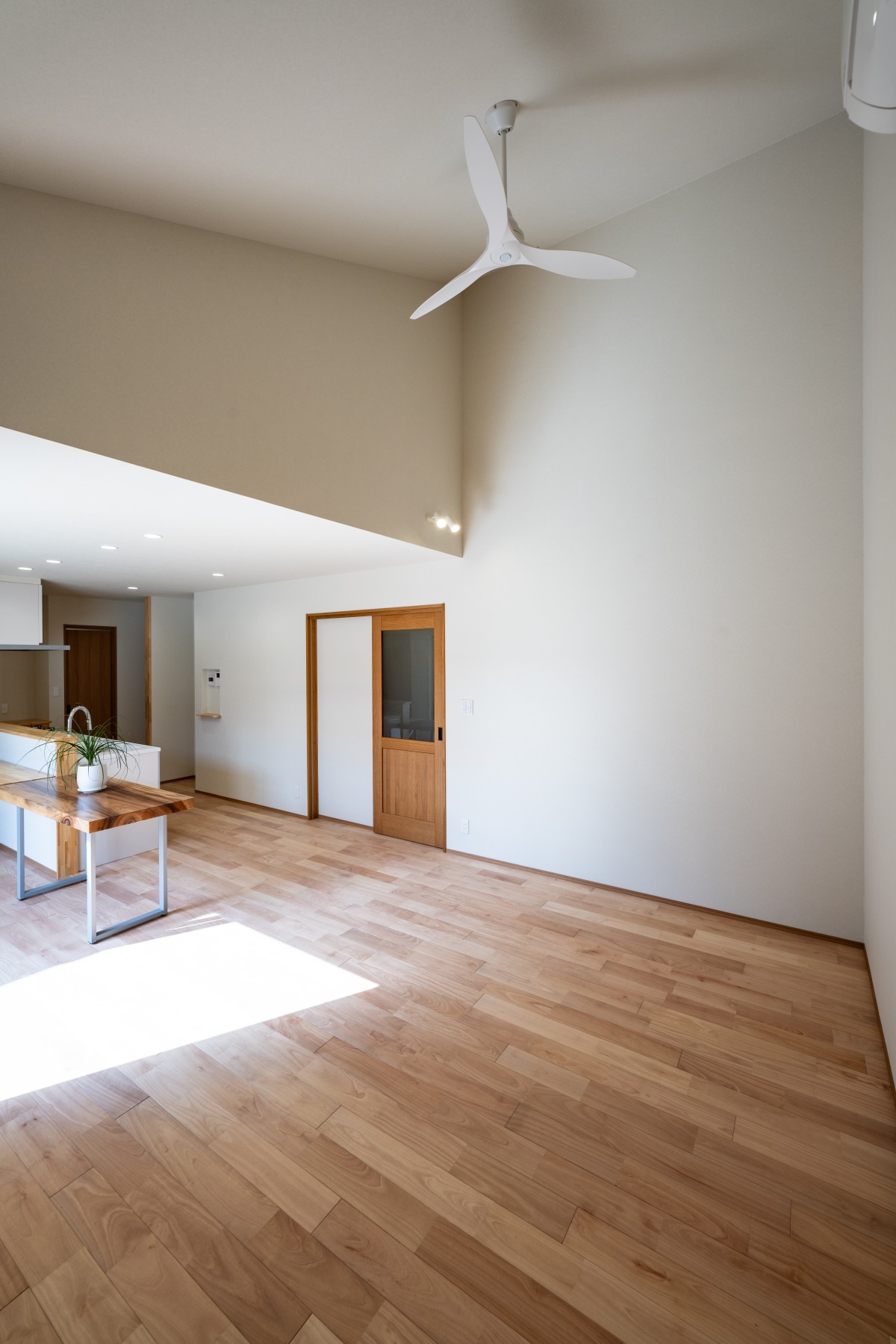 室内に入ると、勾配天井とカバ桜の床が広がるあたたかなLDK。
